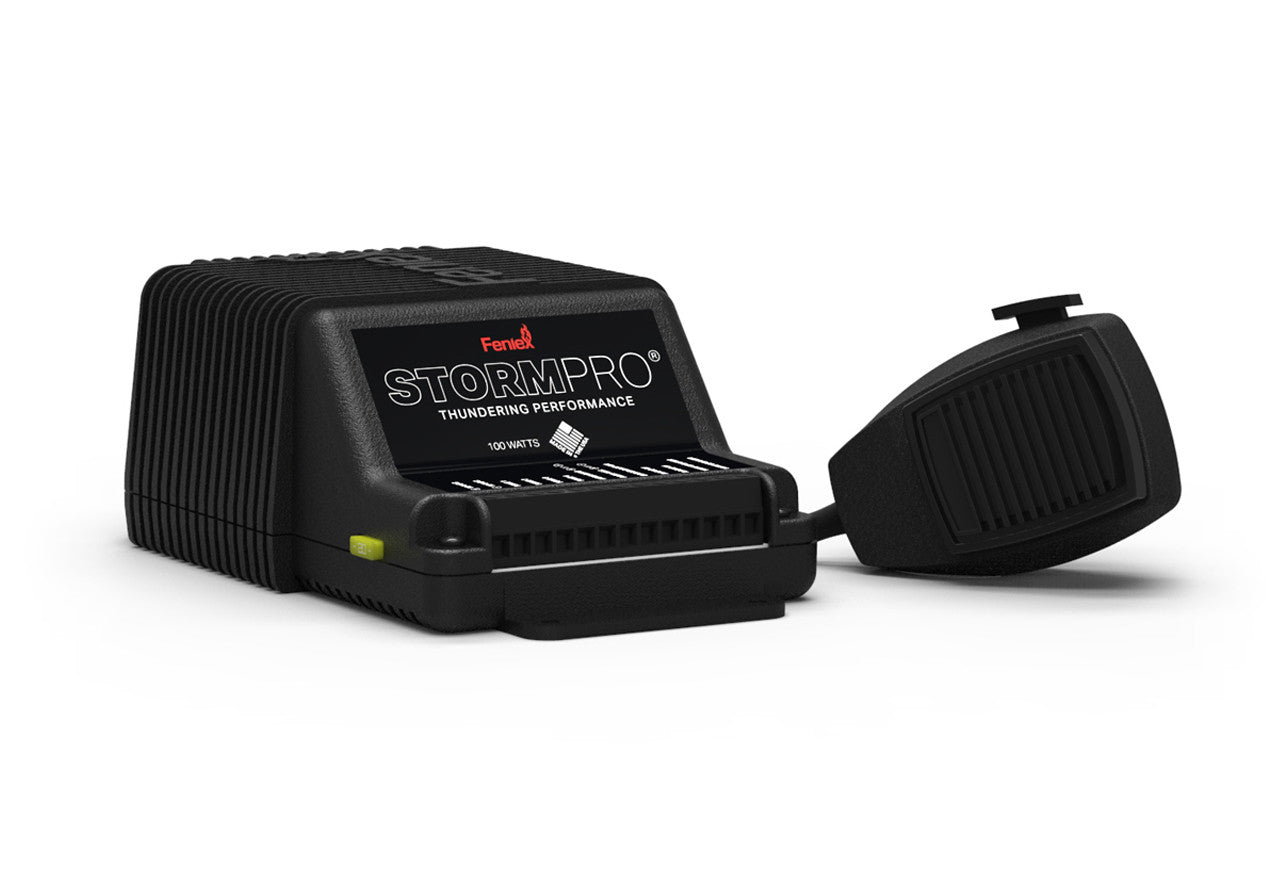 The Storm Pro 100W includes a 6-switch panel with 4 rocket and 2 momentary switches and a microphone set. Controller tones include wail, yelp, phaser, mech siren, and horn.