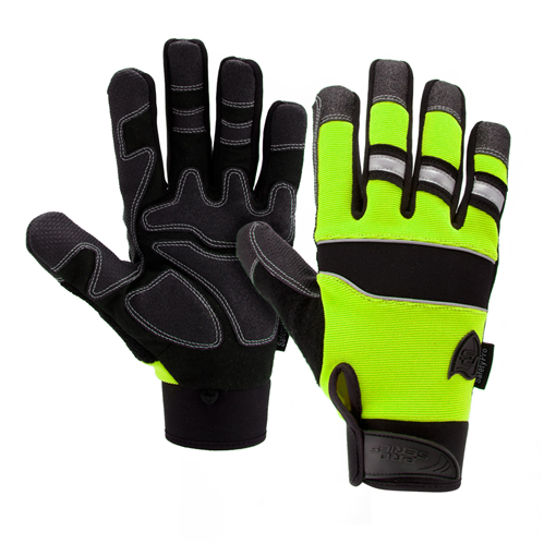 The Pro Series SAFETY features neoprene hook and loop wrist on back of hand, hi-visibility orange 4-way stretch spandex back, synthetic leather palm, neoprene padded knuckles with reflective piping, terry cloth thumb, heavy duty lycra fourchettes, reinforced thumb saddle.