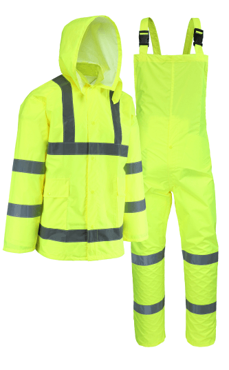 • Material Used: ANSI CLASS III Certified 3-piece high visibility rain suit is made from Poly Oxford material. The polyurethane coating provides maximum visibility, while making the safety wear waterproof from head to toe